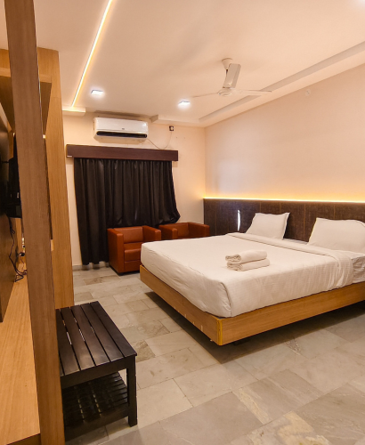 Our Double Deluxe A/C Room offers enhanced comfort with spacious interiors and elegant furnishings. Designed for relaxation and convenience, the room features comfortable bedding, air conditioning, and modern amenities to ensure a pleasant stay.